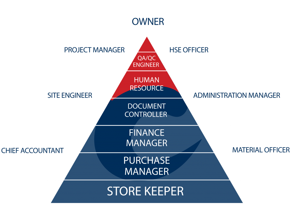 OWNER , PROJECT MANAGER , HSE OFFICER , QA/QC, ENGINEER , SITE ENGINEER , ADMINISTRATION MANAGER , HUMAN RESOURCE , DOCUMENT CONTROLLER , FINANCE MANAGER , CHIEF, ACCOUNTANT , PURCHASE MANAGER , MATERIAL OFFICER , STORE KEEPER
